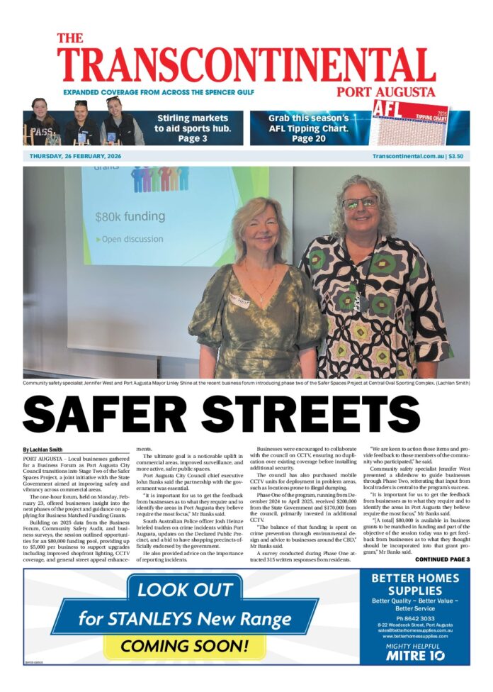 The Transcontinental – 26th February 2026 Subscribe or Login to see the rest of the content. Username Password * Remember Me Forgot Password News Youth Week set to ‘glow’ 12/03/2026 PORT AUGUSTA - A glowing night of movies, music and connection is planned for Port Augusta’s young people during Youth Week, after the Port... Small business Expo coming up 12/03/2026 QUORN - Regional Development Australia Far North will host a Small Business Services Expo and Networking Event this month. The event, to be held... Burpees for a good cause 12/03/2026 WHYALLA - A fitness challenge has delivered a significant boost for a local charity, with more than 2500 meals set to be provided for...