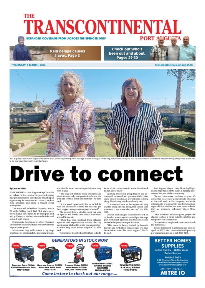 The Transcontinental – 5th March 2026 Subscribe or Login to see the rest of the content. Username Password * Remember Me Forgot Password News Youth Week set to ‘glow’ 12/03/2026 PORT AUGUSTA - A glowing night of movies, music and connection is planned for Port Augusta’s young people during Youth Week, after the Port... Small business Expo coming up 12/03/2026 QUORN - Regional Development Australia Far North will host a Small Business Services Expo and Networking Event this month. The event, to be held... Burpees for a good cause 12/03/2026 WHYALLA - A fitness challenge has delivered a significant boost for a local charity, with more than 2500 meals set to be provided for...