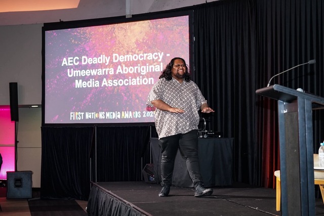 Umeewarra Media broadcaster Dre Ngatokorua accepting one of the three awards the station received during the 2025 First Nations Media Australia (FNMA) Awards. (supplied)