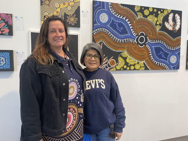 Port Augusta Secondary School YES Centre SSOs Marie Noll and Rachaya Sriyouk at the YES exhibition the PASS students had been involved in at Yarta Purtli Art Gallery. (Lachlan Smith)