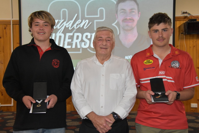 U15 Nobbs Medal winners Centrals Diesel Arnold and Souths Leo McInnes with presenter Nick Heron. (Sue Dalla Santa).