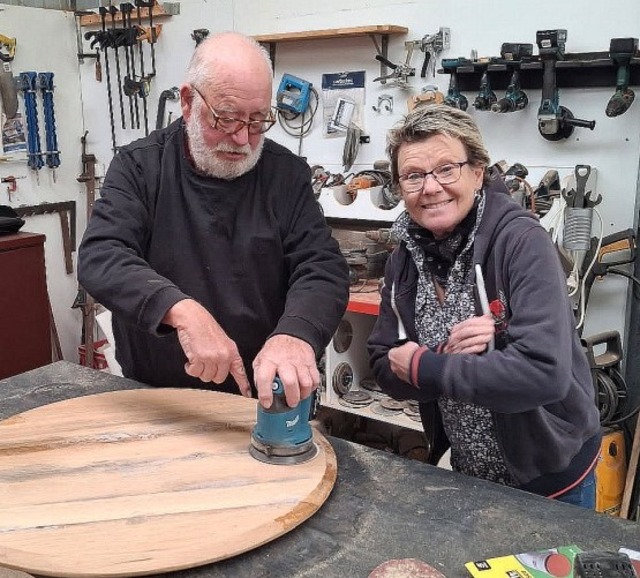 Ian shows Kathy sanding techniques at the Quorn Men's Shed. (Supplied)