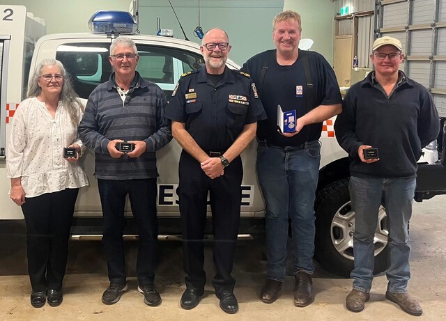 Spalding SES Unit awards recipients from left, Margeret Bruce, David Bruce, SES Deputy Chief Officer Darryl Wright, Reinhold Wehrmann and Andrew Cootes (supplied)