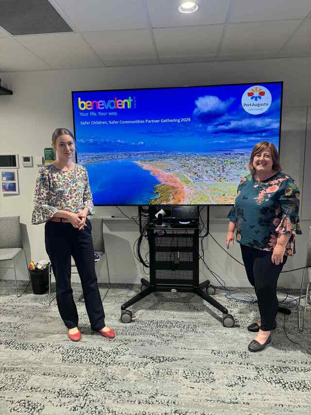 Port Augusta City Council Community Development staff members Clementine Menz and Brooke Mundy making a presentation in Sydney recently around the council’s program to The Benevolent Society and Westpac. (supplied)