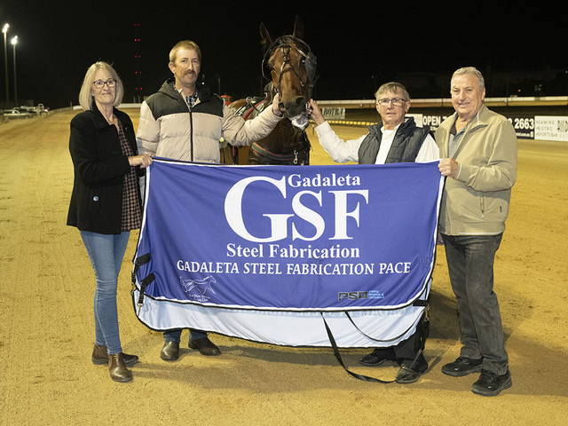 Tembie owned by Ron and Lee-Anne Lane and Robyn Abell, trained by Dale Afford won the Gadaleta Steel Fabrications Pace on April 13, 2024. From left Lee-Anne Lane, her son Danny Francis, Tembie, Port Pirie Harness Racing Club President Mick Darling and Ron Lane (Walter Bulyga)