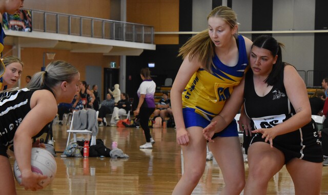 Joes' Ella Humphrys ready to block a pass from Magpies' Zara Thiele to Aysha Zada (Sue Dalla Santa: 499990_05)